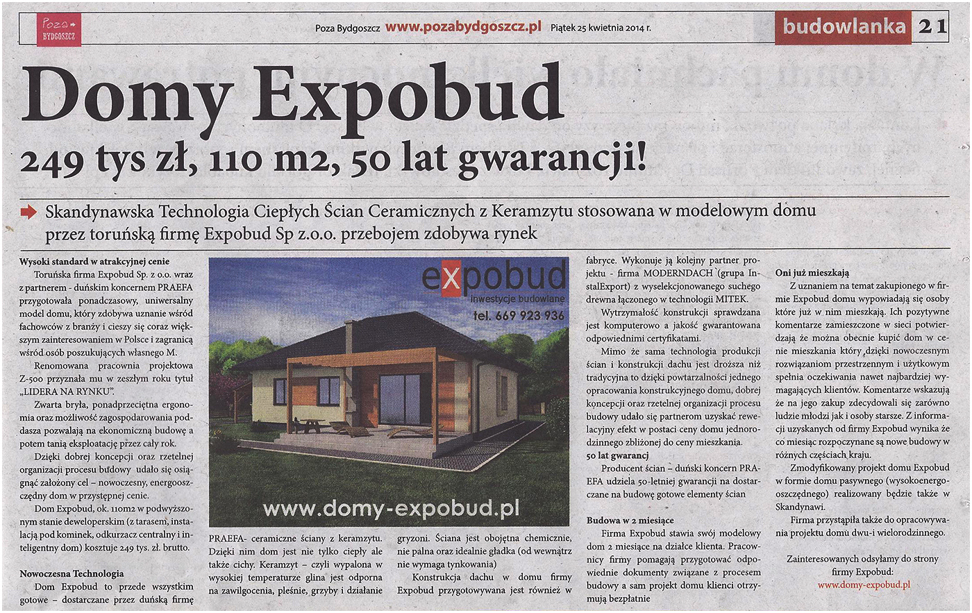 Jesteśmy największym w Polsce wykonawcą domów jednorodzinnych wznoszonych w technologii ciepłych prefabrykowanych ścian z keramzytu. Obecnie budujemy ponad 300 domów rocznie co oznacza, że prawie każdego dnia gdzieś w kraju rozpoczynamy nowe budowy. Łącznie wybudowaliśmy już blisko 1500 domów EXPOBUD®. Wykorzystywana przez nas technologia pozwala wznosić nowoczesne wysoko-energooszczędne budynki nawet w ciągu dwóch miesięcy od wejścia na plac budowy. Od lat specjalizujemy się w nowoczesnych rozwiązaniach wykorzystywanych w budownictwie jedno- i wielorodzinnym. Budujemy z pasją.